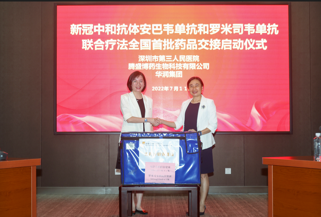 繼2022年7月7日,首批新冠中和抗體安巴韋單抗和羅米司韋單抗聯(lián)合療法實現(xiàn)商業(yè)放行后,7月9日,經(jīng)過騰盛博藥全體同仁和商業(yè)合作伙伴華潤廣東醫(yī)藥公司的不懈努力,我國首批中和抗體藥物順利送達深圳市第三人民醫(yī)院,全國首處方落地。安巴韋單抗和羅米司韋單抗是深圳市第三人民醫(yī)院與清華大學和騰盛博藥合作從新型冠狀病毒肺炎(COVID-19)康復期患者中獲得的非競爭性新型嚴重急性呼吸系統(tǒng)綜合癥病毒2(SARS-CoV-2)單克隆中和抗體,于2021年12月獲得國家藥品監(jiān)督管理局上市批準, 7月7日在中國商業(yè)化上市,是我國首個獲批的自主研發(fā)的新冠抗體藥物。