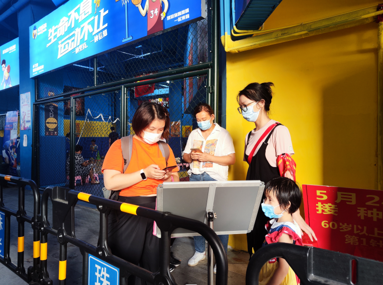 第一道關(guān)卡,嚴(yán)防死守,要求進(jìn)店顧客握牢防疫“三板斧”:佩戴口罩、測體溫、掃場所碼。