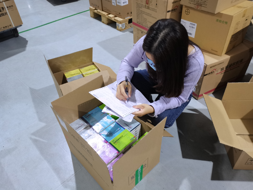 隊(duì)伍成員一到倉庫就投入忙碌而有序的工作中,在一線物流同事傳幫帶的引領(lǐng)下,隊(duì)員們很快學(xué)會(huì)了基本的操作流程,紛紛投入到各自崗位工作中。沒有一份工作是輕而易舉的,都需要每位人員時(shí)刻保持仔細(xì)嚴(yán)謹(jǐn)?shù)墓ぷ鲬B(tài)度。如揀選藥品,從收到訂單、尋找貨位碼、再到掃碼數(shù)貨,這看似簡單的工作實(shí)際內(nèi)里大有學(xué)問,有些訂單會(huì)涉及到藥監(jiān)碼掃碼,并且一個(gè)訂單就要掃上百個(gè)碼;再如復(fù)核貨品,選好的貨品要經(jīng)過二次清點(diǎn)且確認(rèn)無誤后按批裝箱,不能出現(xiàn)任何失誤。每個(gè)步驟都十分挑戰(zhàn)工作人員的細(xì)心與耐心,確保送到醫(yī)院及社區(qū)手中的防疫物資準(zhǔn)確無誤。