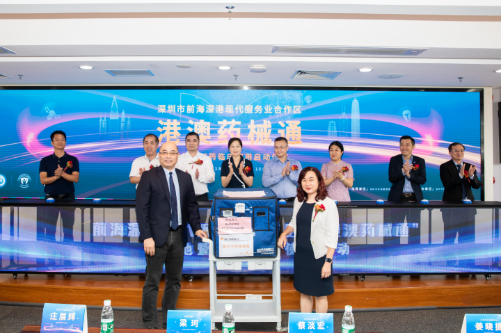 當(dāng)天,在前海蛇口自貿(mào)區(qū)醫(yī)院,區(qū)委衛(wèi)生工委專職副書記兼紀(jì)委書記、區(qū)衛(wèi)生健康局黨組成員張浩主持舉行了“港澳藥械通”落地暨首藥臨床使用啟動(dòng)儀式。前海合作區(qū)黨工委副書記梁珂,南山區(qū)副區(qū)長(zhǎng)蔡淡宏,深圳市衛(wèi)健委醫(yī)政醫(yī)管處二級(jí)調(diào)研員莊展輝,深圳市市場(chǎng)監(jiān)管局及南山局,香港中文大學(xué)(深圳)醫(yī)學(xué)院,市、區(qū)人大代表,華潤(rùn)廣東醫(yī)藥有限公司,大灣區(qū)醫(yī)療集團(tuán)、市區(qū)部分醫(yī)院等相關(guān)領(lǐng)導(dǎo)以及香港蛇口同鄉(xiāng)會(huì)代表出席了此次儀式,共同見(jiàn)證前海合作區(qū)內(nèi)首批“港澳藥械通”獲批藥品英克西蘭、阿培利司的交接。