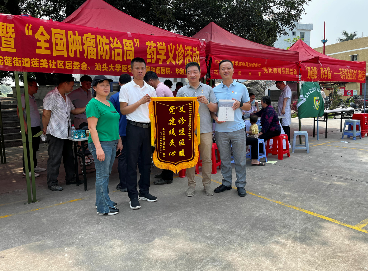 活動現(xiàn)場,工作人員通過向往來居民開展癌癥防控科普宣傳、普及抗癌健康知識,全面提升全社會癌癥防控意識;為居民測量血壓,并發(fā)放宣傳折頁普及藥品的正確使用方法、注意事項;向群眾發(fā)放藿香正氣合劑,小柴胡顆粒、金嗓子喉片等日常便藥,叮囑用量、答疑解惑確保群眾用藥安全?;顒咏Y束,中共蓮美社區(qū)委員會為汕頭支部送上錦旗,感謝支部為社區(qū)居民健康做出的努力,更是激勵汕頭支部惠民活動再上新臺階。