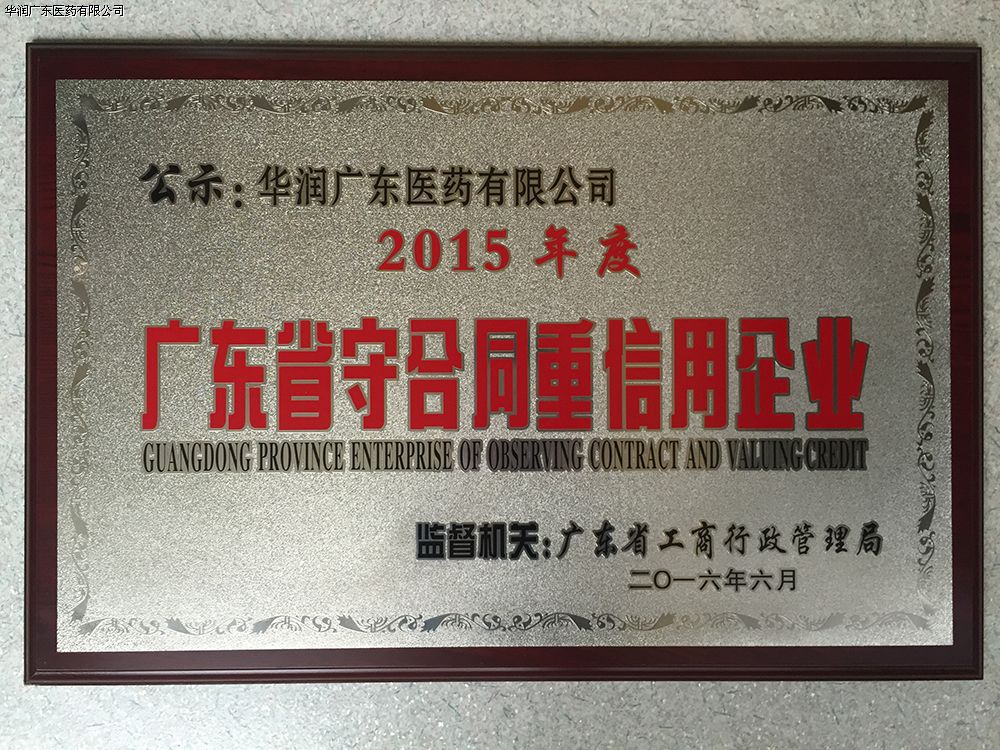 近日,2015年度“廣東省守合同重信用企業(yè)”評選結(jié)果出爐,華潤廣東醫(yī)藥有限公司被廣東省工商行政管理局授予“2015年度廣東省守合同重信用企業(yè)”的稱號。