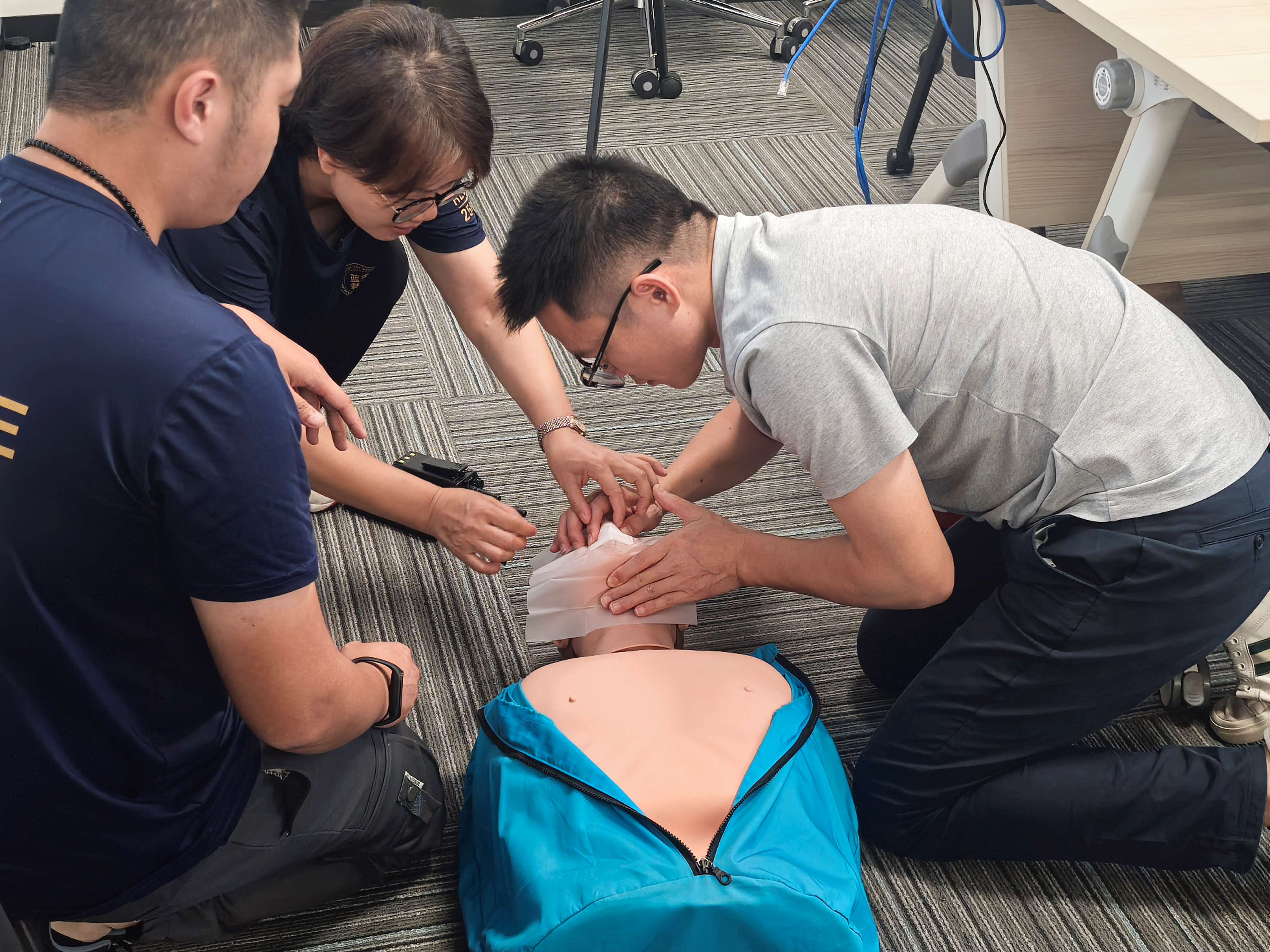 活動(dòng)伊始,湛江市藍(lán)天救援隊(duì)的專業(yè)講師毛成通過專業(yè)知識(shí)講授、實(shí)際案例分析等形式,圍繞火災(zāi)逃生、心肺復(fù)蘇、海姆立克急救法等重要主題展開培訓(xùn)。大家在現(xiàn)場實(shí)操練習(xí)徒手心肺復(fù)蘇操作及海姆立克急救法。