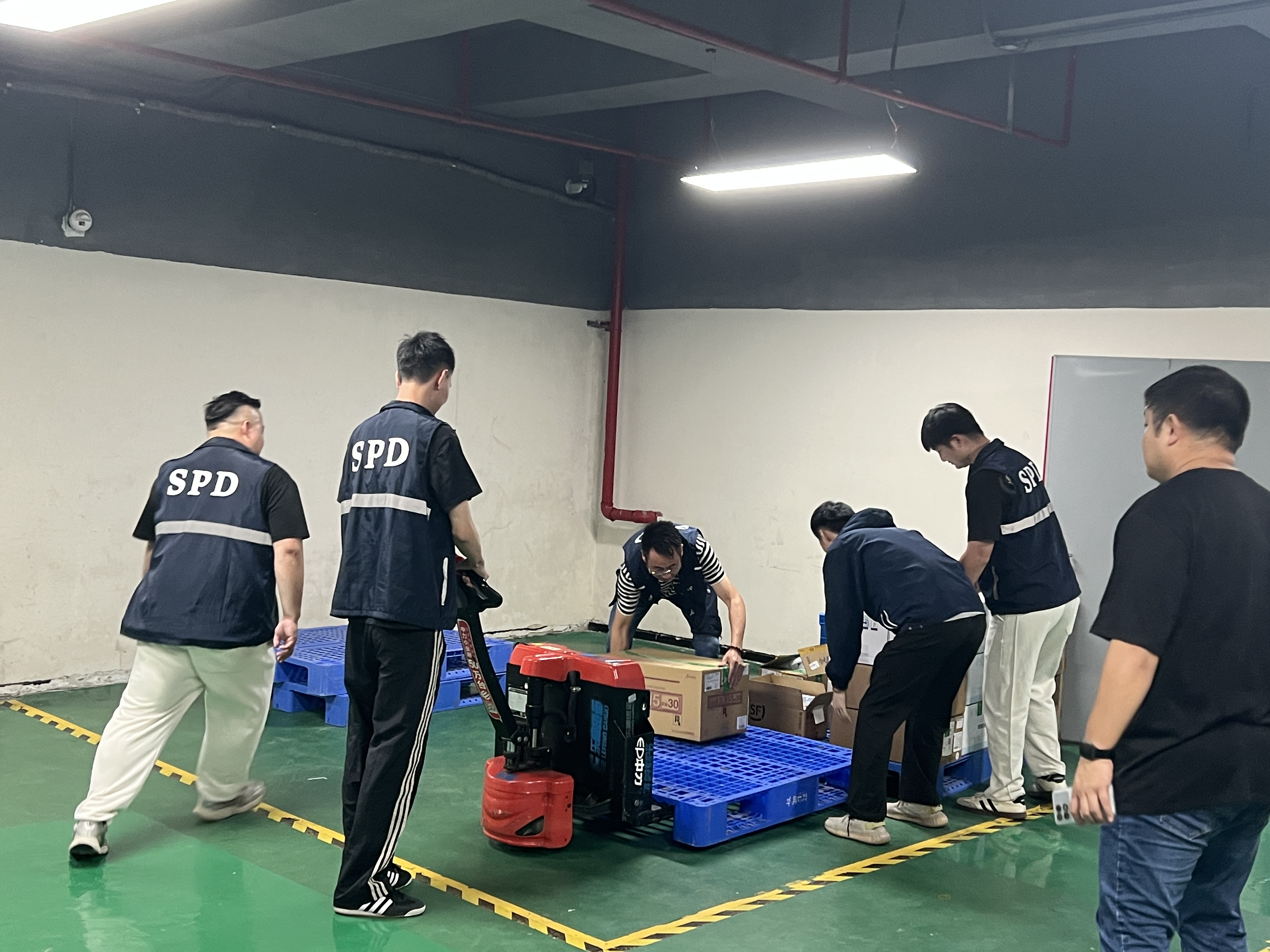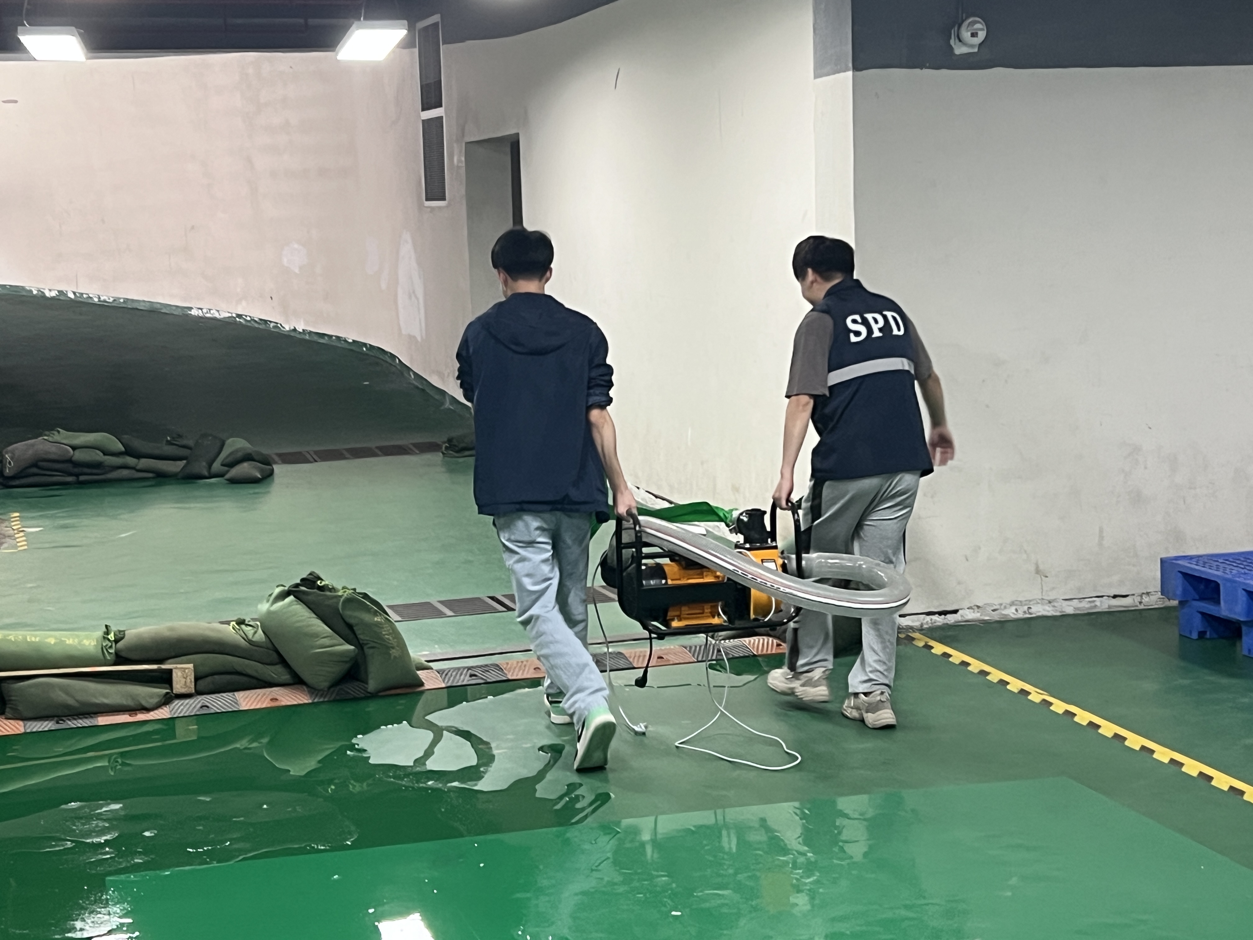 應(yīng)急小組迅速響應(yīng),搶險(xiǎn)救援組快速抵達(dá)現(xiàn)場(chǎng),將被積水威脅的貨物轉(zhuǎn)移至安全區(qū)域,并組織人員堆砌沙包、清理積水,并妥善處置破損物品;警戒疏散組迅速將防洪閘推至預(yù)定位置,對(duì)倉(cāng)庫(kù)門口區(qū)域警戒,檢查并準(zhǔn)備好水泵,引導(dǎo)模擬無(wú)關(guān)人員有序撤離,維持警戒區(qū)域治安;后勤保障組確認(rèn)水淹區(qū)域電源情況,進(jìn)行斷電或恢復(fù)供電操作,同時(shí)向各小組發(fā)放充足的防洪防汛工具及物資,并與醫(yī)院取得聯(lián)系,記錄溝通結(jié)果。最終當(dāng)現(xiàn)場(chǎng)積水清理完畢,貨物安全轉(zhuǎn)移,演練圓滿結(jié)束。