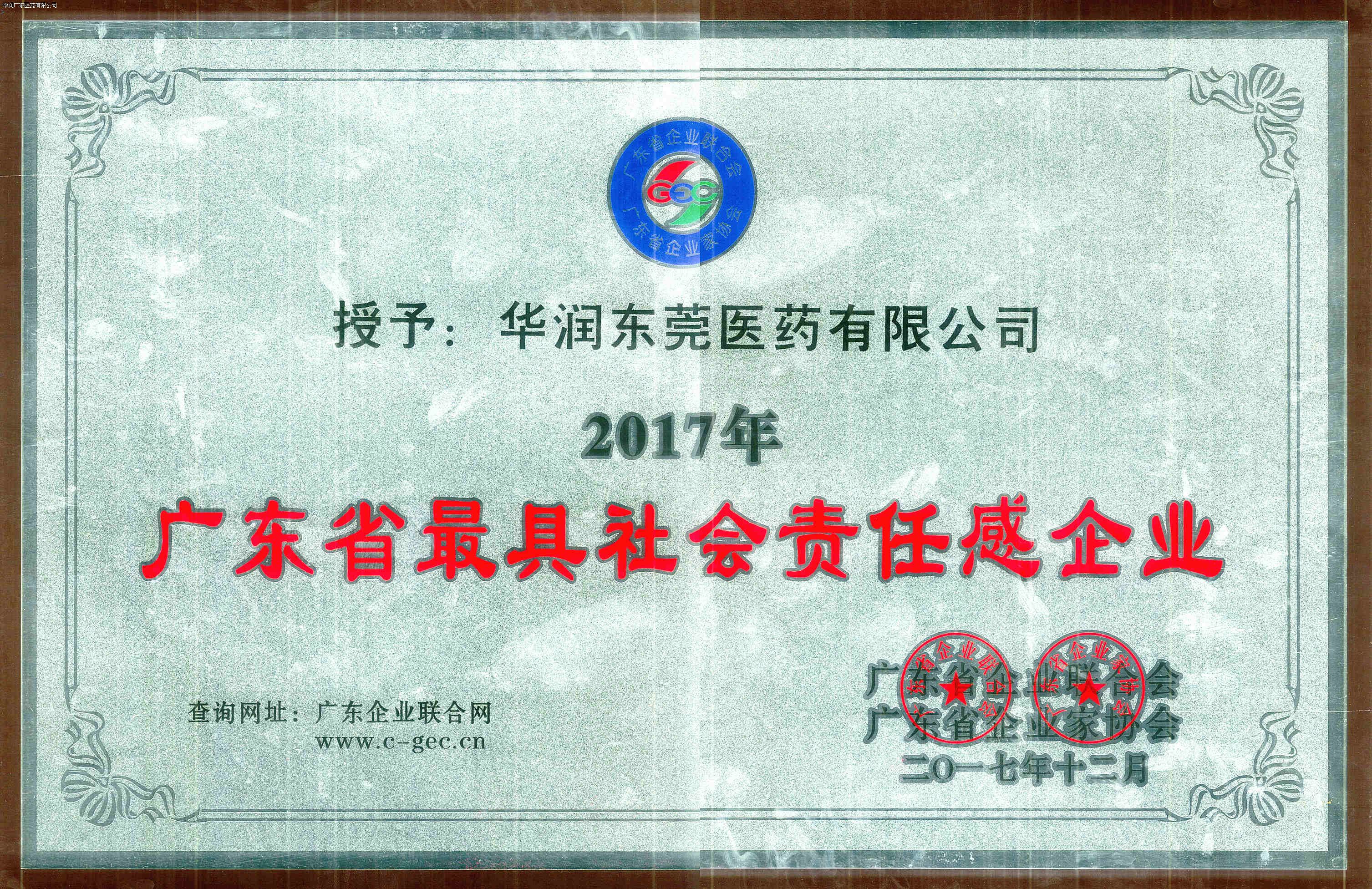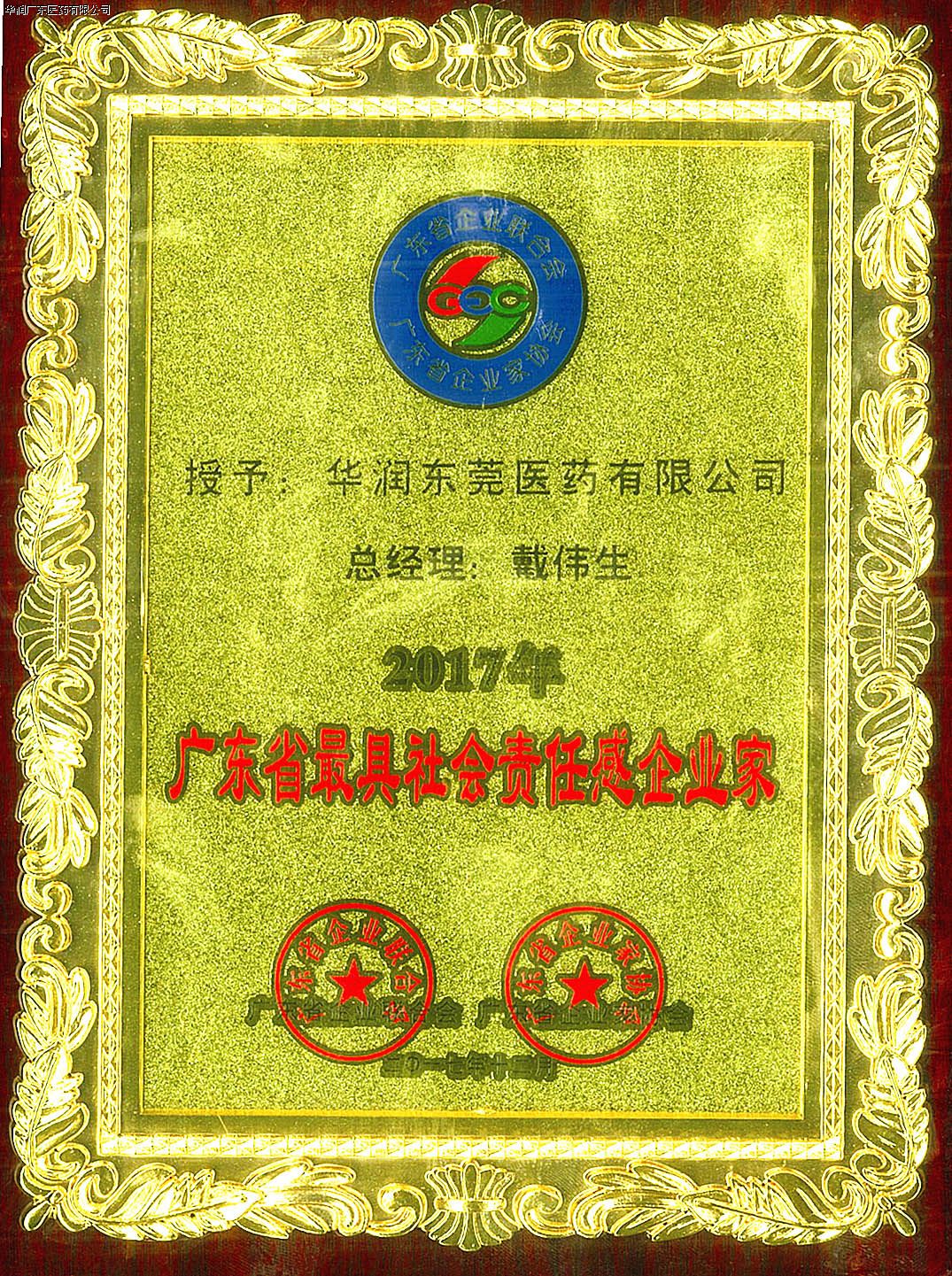 2017年12月21日,由廣東省企業(yè)聯(lián)合會、廣東省企業(yè)家協(xié)會主辦的“2017廣東企業(yè)家年會”在廣州隆重舉行。年會以“新時代 新責(zé)任 新征程”為主題,號召全省企業(yè)家以黨的十九大精神為指引,立足新時代,凝聚新力量,開啟新征程。全省企業(yè)家代表、部分行業(yè)協(xié)會商會、各地企聯(lián)負(fù)責(zé)人約600人出席了會議。華潤東莞醫(yī)藥有限公司(以下簡稱“華潤東莞醫(yī)藥”)榮獲“2017年廣東省最具社會責(zé)任感企業(yè)”稱號,公司總經(jīng)理戴偉生先生榮獲“2017年廣東省最具社會責(zé)任感企業(yè)家”稱號。