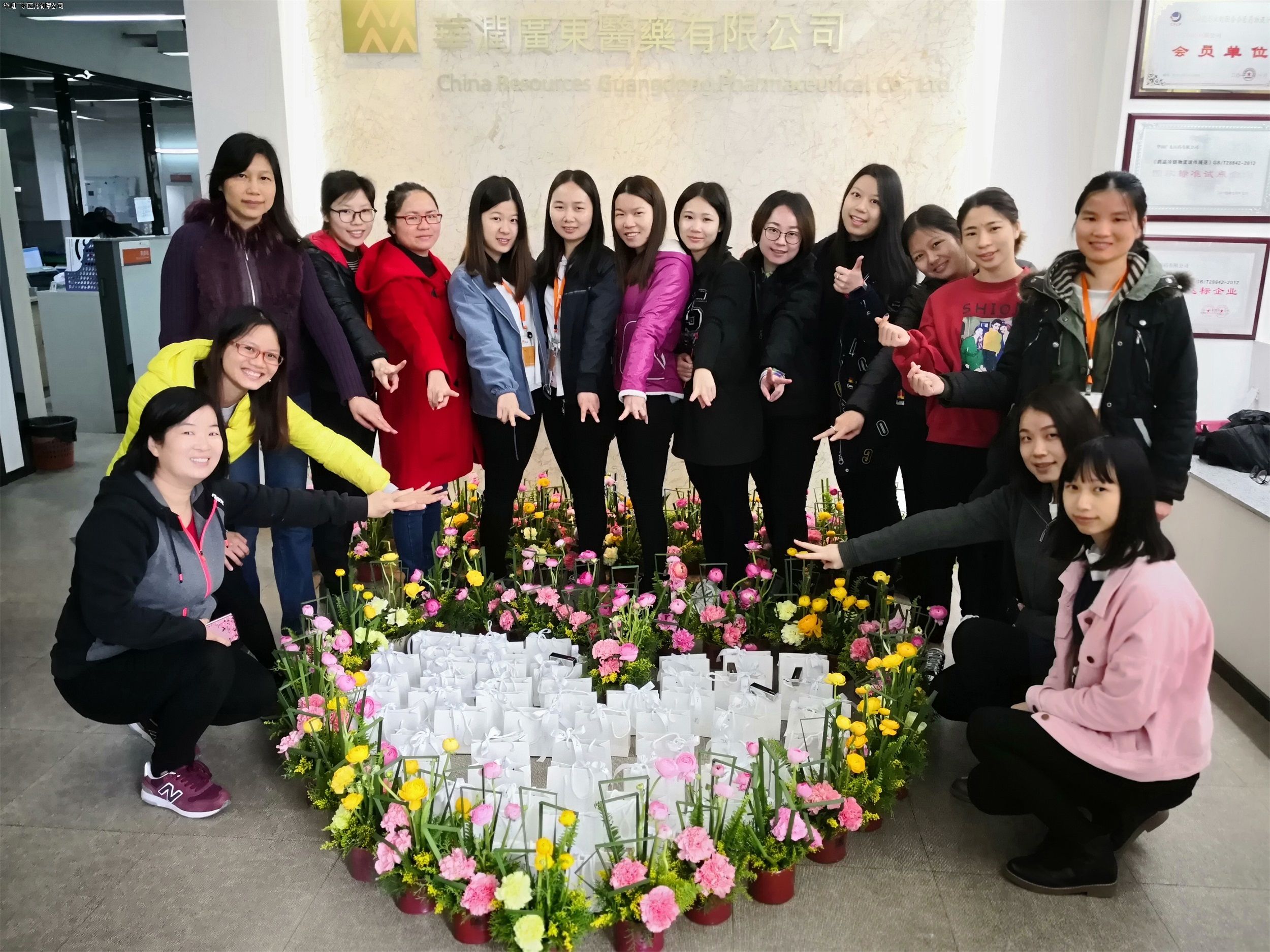 初春的清晨,依然繾綣著幾分寒意,卻絲毫沒有驅(qū)散女職工們內(nèi)心的激動(dòng)和暖意。2018年3月8日,在華潤(rùn)廣東醫(yī)藥有限公司工會(huì)委員會(huì)的精心布置下,為全體女職工準(zhǔn)備的100多盆匠心設(shè)計(jì)的小盆栽被拼湊成華潤(rùn)logo和“3.8”圖案,猶如一個(gè)個(gè)盛裝登場(chǎng)的花仙子,裝點(diǎn)著公司前臺(tái),成為公司最亮麗的節(jié)日風(fēng)景。女職工們被這一波觸不及防的小心思感動(dòng),臉上無不洋溢著如花一般的燦爛笑容。她們齊聚花海,在鮮花的簇?fù)硐潞嫌?,互?zèng)祝福,一派溫馨動(dòng)人。