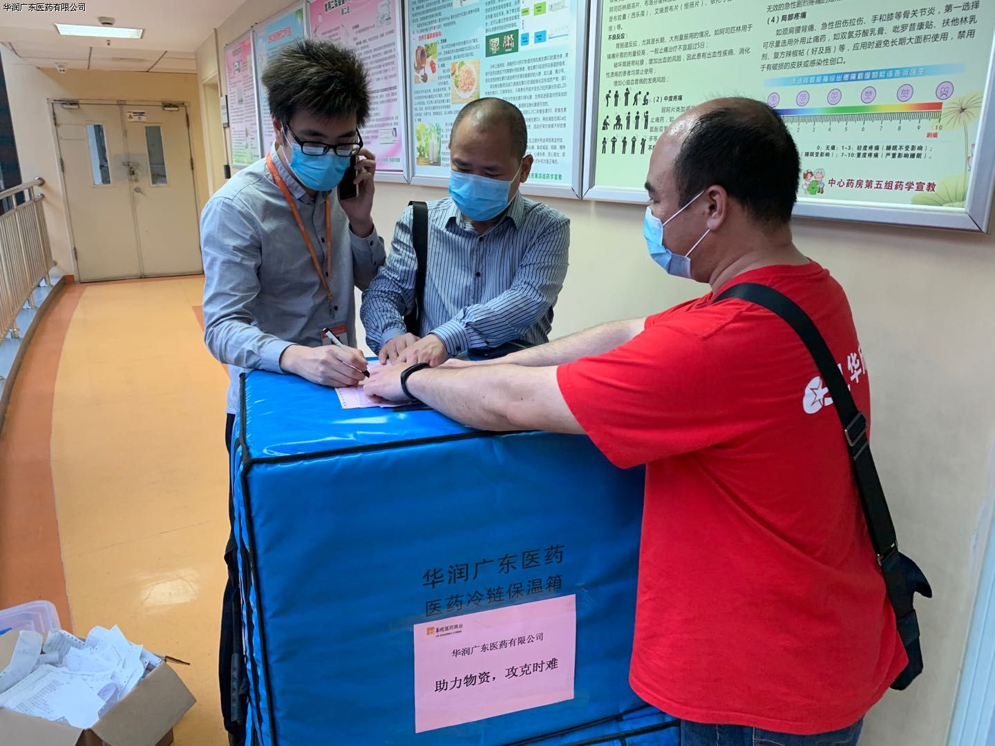 29日,華潤廣東醫(yī)藥工作人員連同中國初級衛(wèi)生保健基金會廣州生命綠洲公益服務中心公益專員,將捐贈藥品通過冷鏈物流方式送抵廣州呼吸健康研究院。