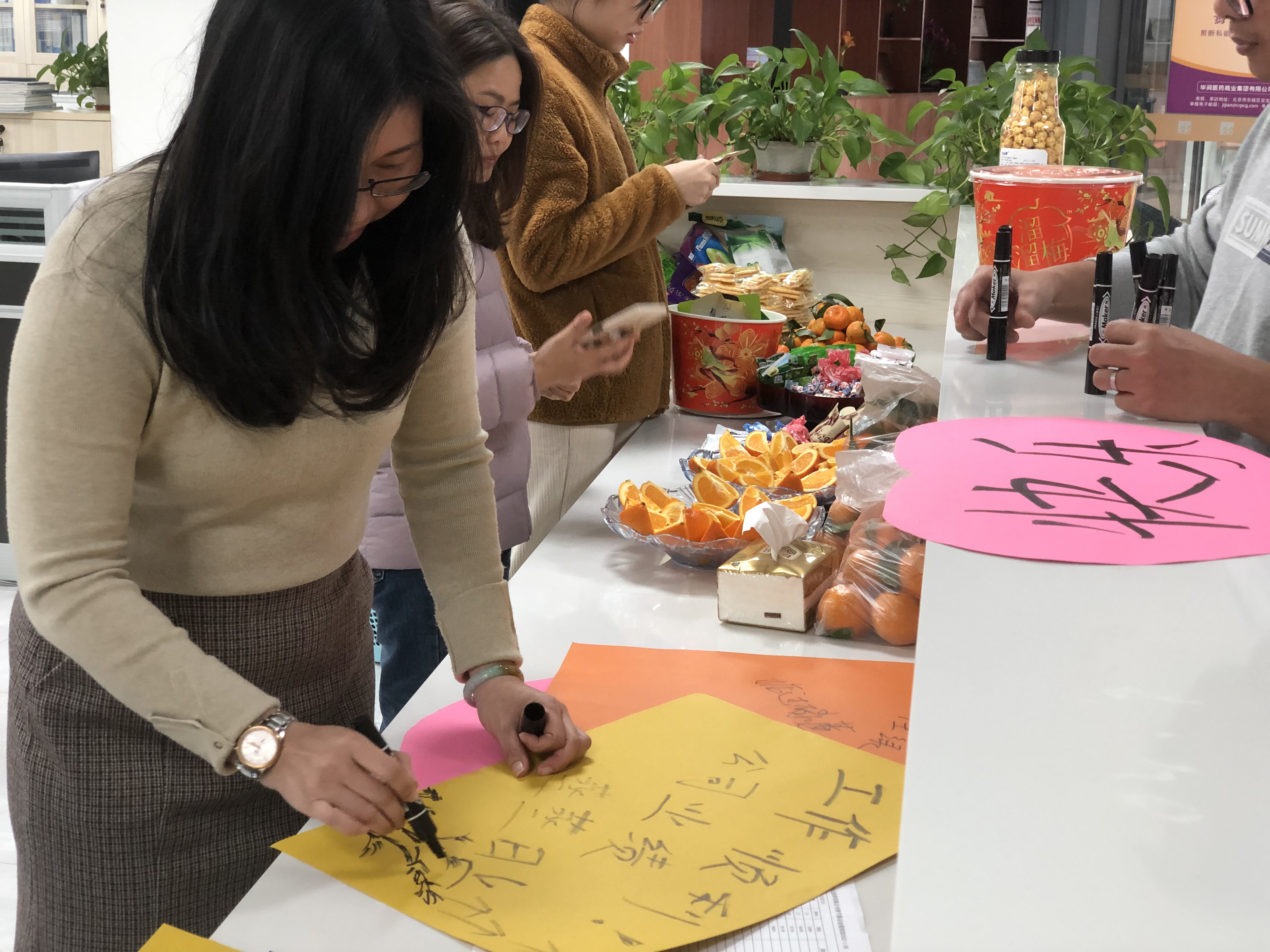 下午15點(diǎn),由工會提前準(zhǔn)備好茶話會的水果零食等,大家準(zhǔn)時(shí)在活動地點(diǎn)集合。雖然天氣寒冷,但是大家熱情高漲,紛紛提筆寫下了新春的祝福和寄望。然后一起品嘗著美食互相交談,到處都是笑語盈盈,充滿著歡樂和溫馨。最后本次活動在大家的歡聲笑語中圓滿結(jié)束。